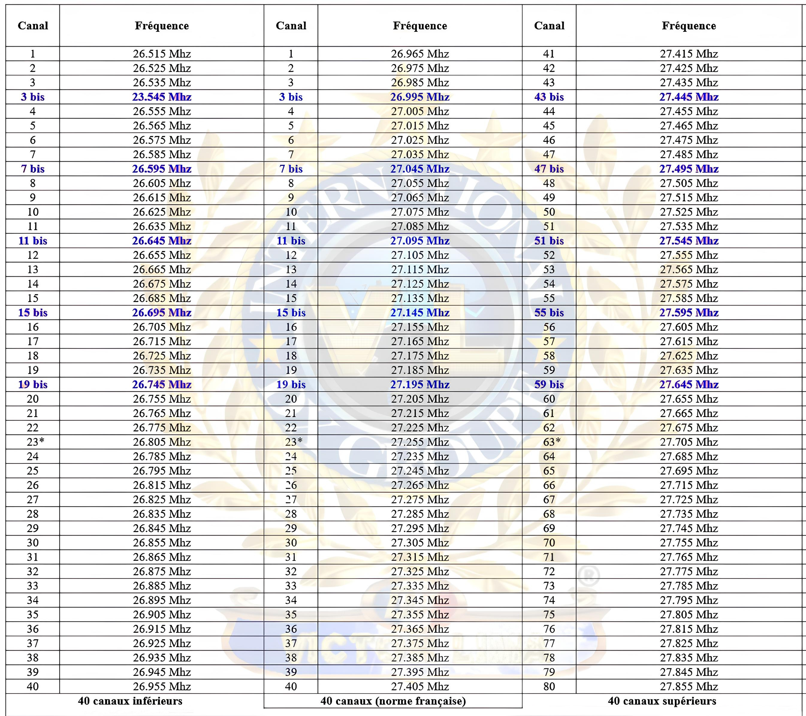 * Les canaux homologués en France vont de 26,965 à 27,405 MHz avec une puissance maximum de 4 W en FM et BLU, 1 W en AM.